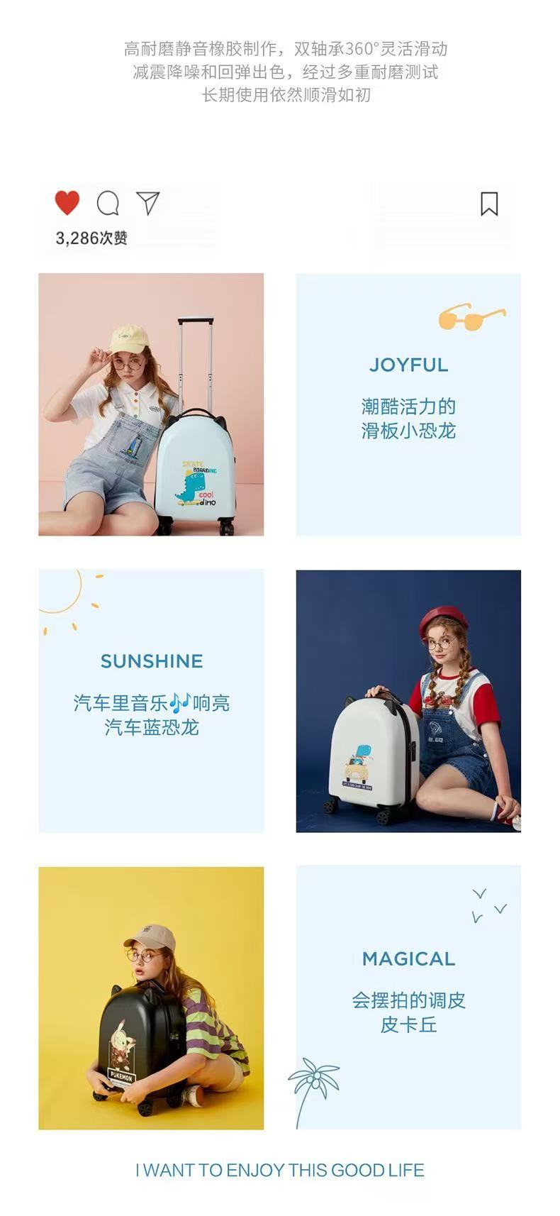 Made of ABS+PC composite material, lightweight enough for kids to pull, scratch-resistant and sturdy to withstand travel bumps.