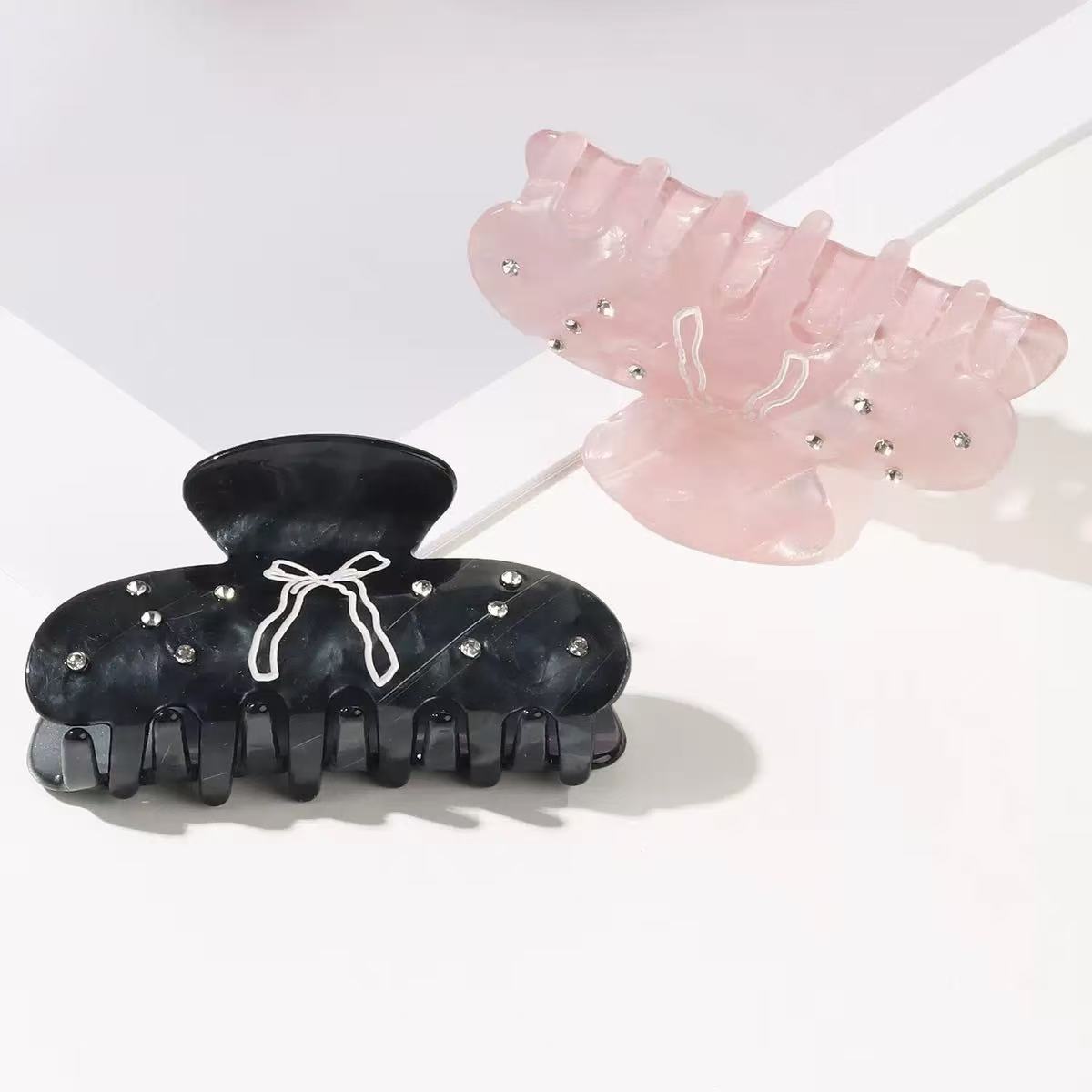 Crafted from high-quality acetate, this claw clip features a hand-painted bow and subtle imitation diamond accents, balancing sweetness with sophistication. Available in black and pink, it’s a versatile piece for creating relaxed, stylish looks.